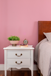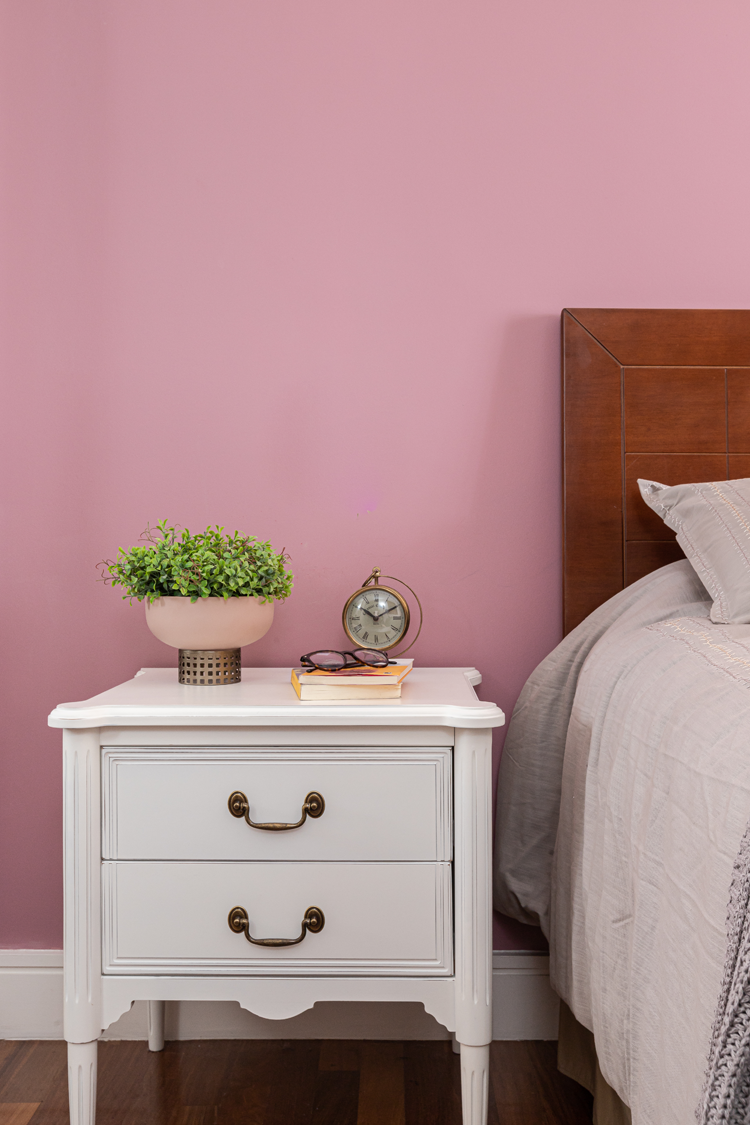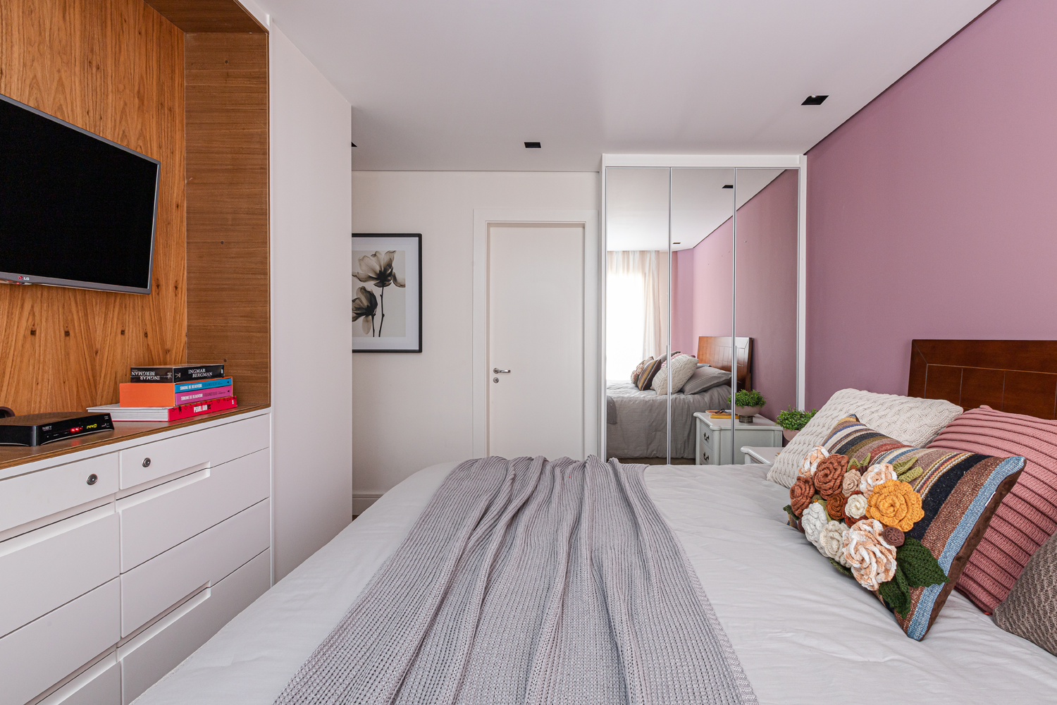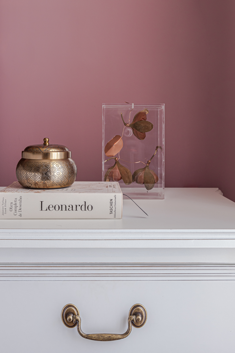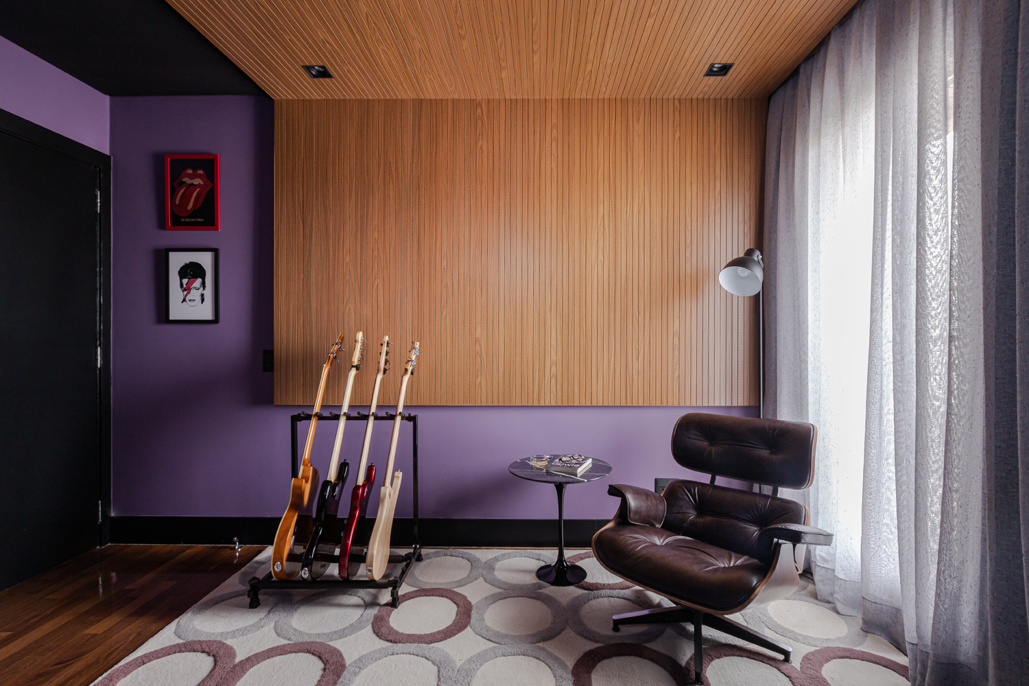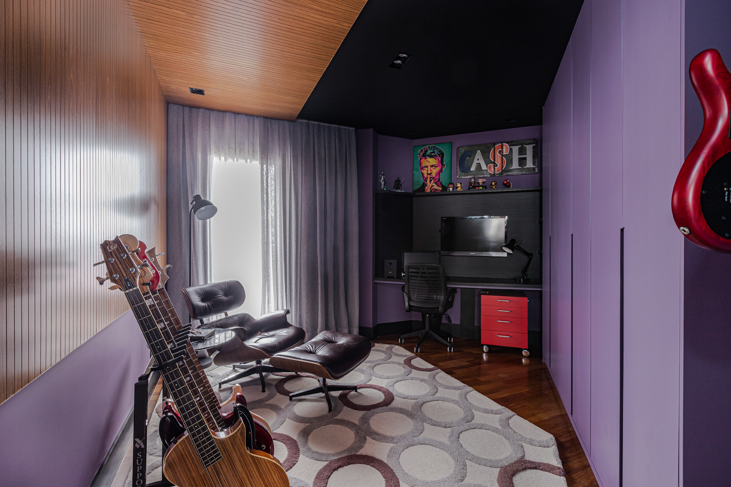 A sala de música traz um eficiente isolamento acústico. Usamos um painel de MDF amadeirado específico para absorção sonora na parede e no teto, somado ao tapete e à cortina. Já do outro lado, o móvel sob medida tem lugar para embutir a TV, além da bancada de trabalho e uma prateleira funcional. A parede roxa é um dos destaques deste ambiente, somada ao uso de cortina e tapete com nuances mais claras. Aqui, o contraste fica por conta do gaveteiro vermelho que dá um toque especial.