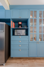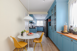 O coração deste apartamento é a cozinha com marcenaria azul integrada à charmosa sala de almoço. No projeto de reforma também criamos uma gostosa sala de música, onde o morador pode fazer suas aulas e ensaios, além da modernização de ambientes sociais, quartos e banheiros.