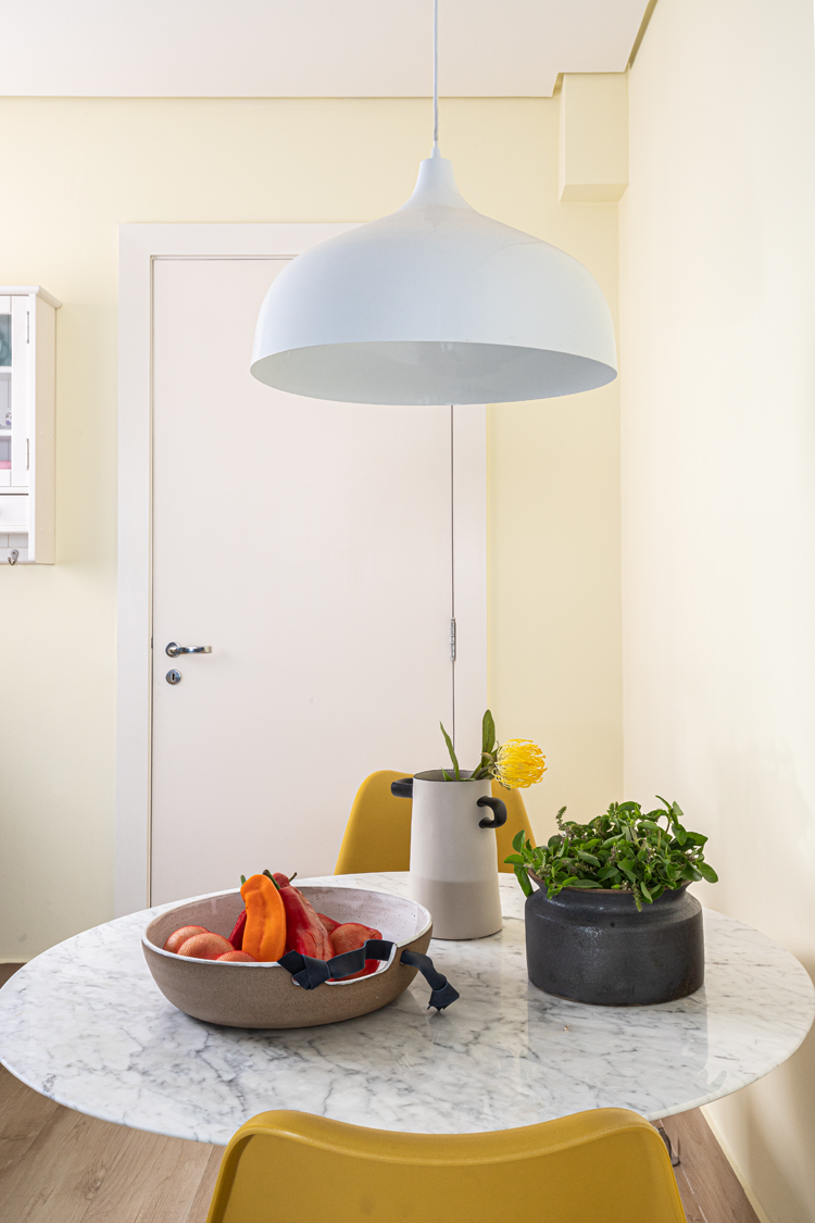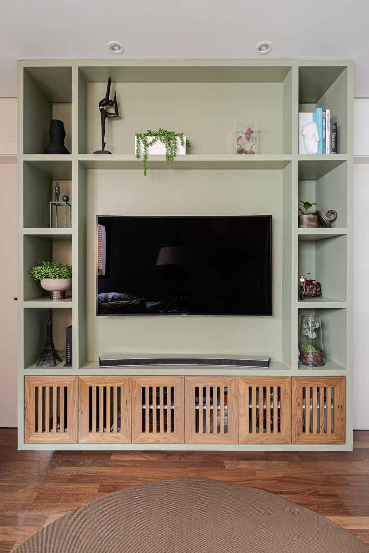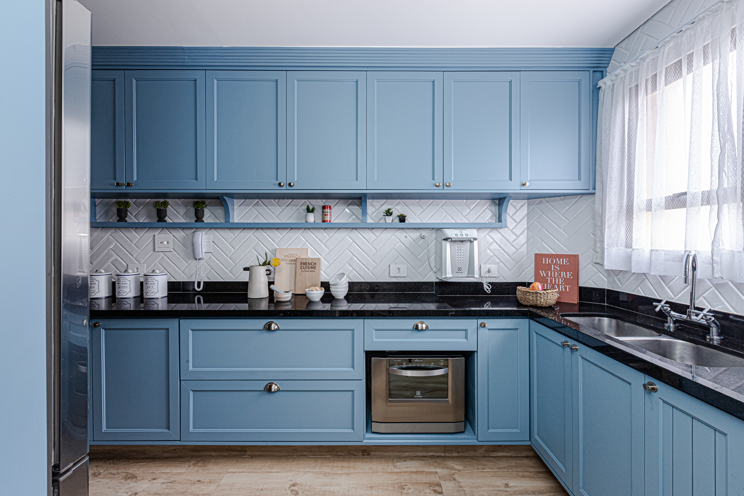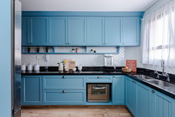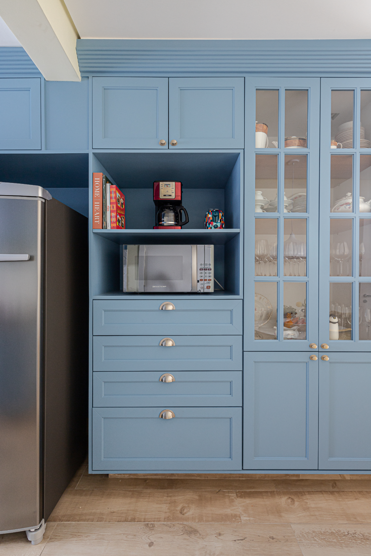 A cozinha revela um moodboard suave, destacando a laca azul da marcenaria que foi planejada para aproveitar ao máximo cada centímetro. Ao abrirmos a parede que dividia o ambiente com a copa, favorecemos a interação os moradores, que adoram curtir o espaço juntos.