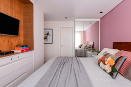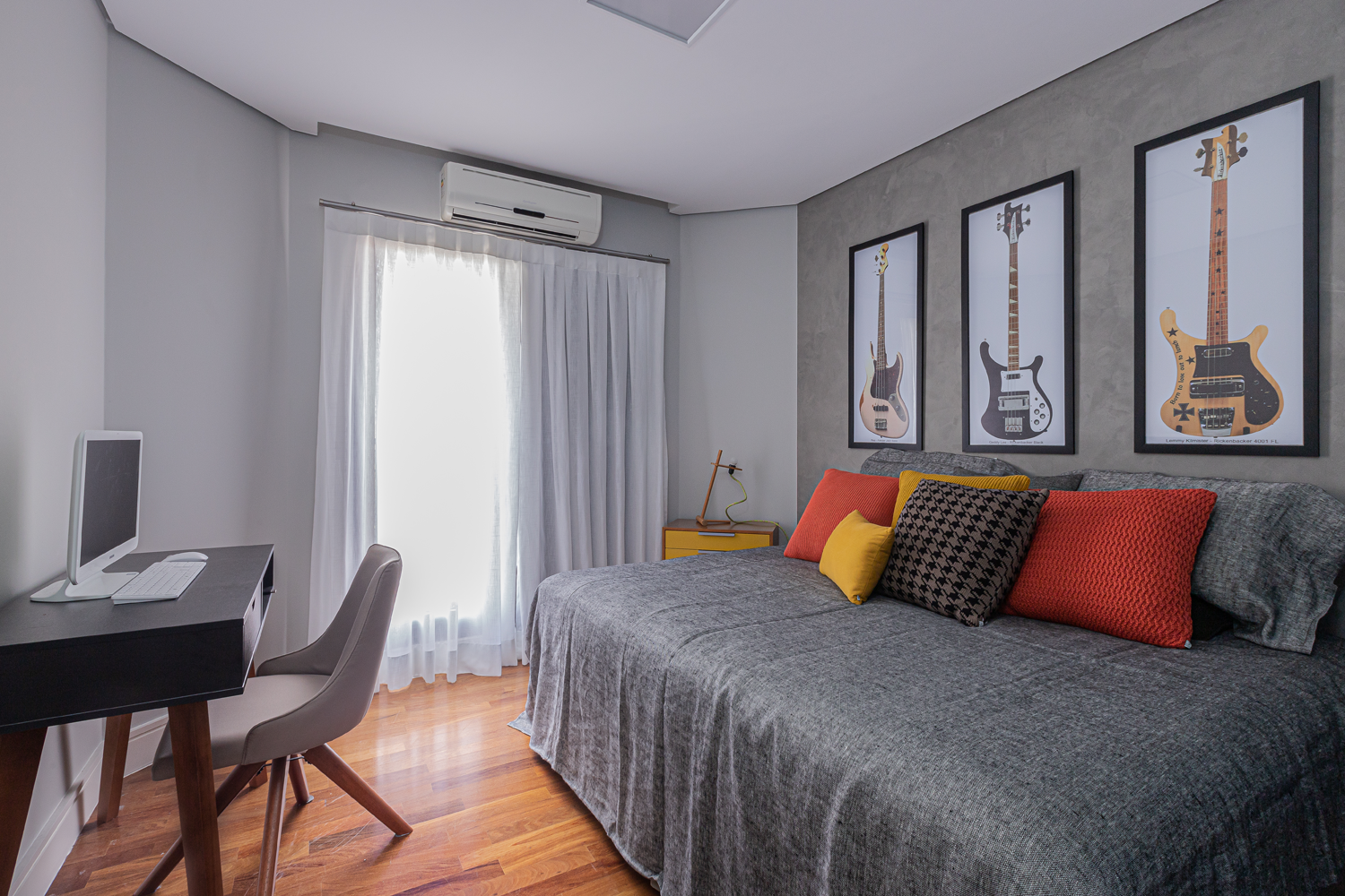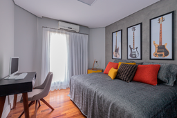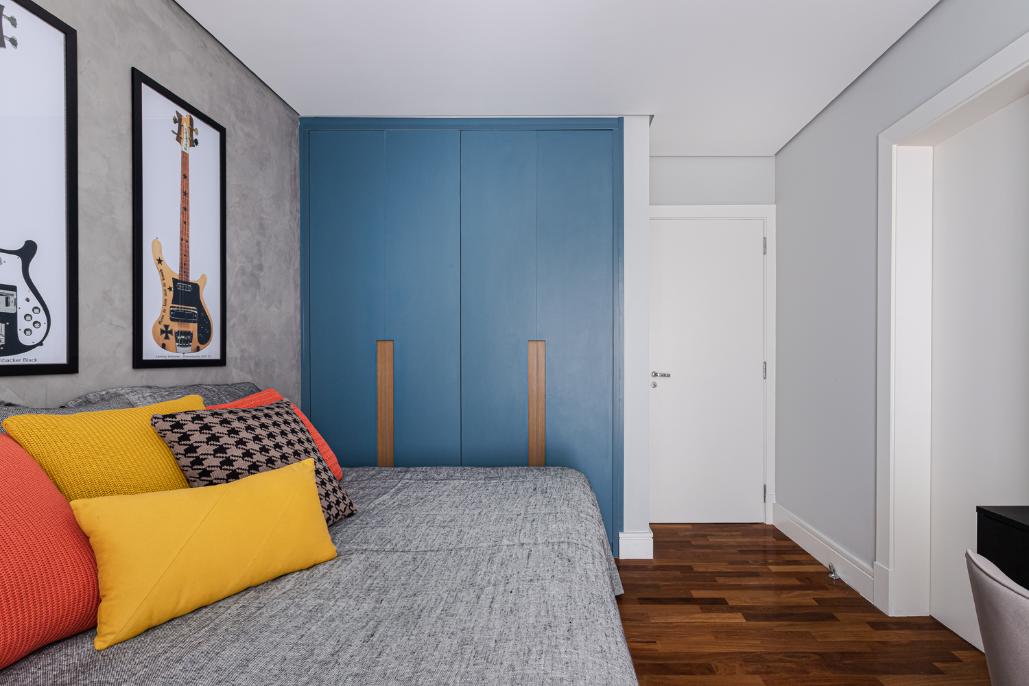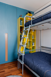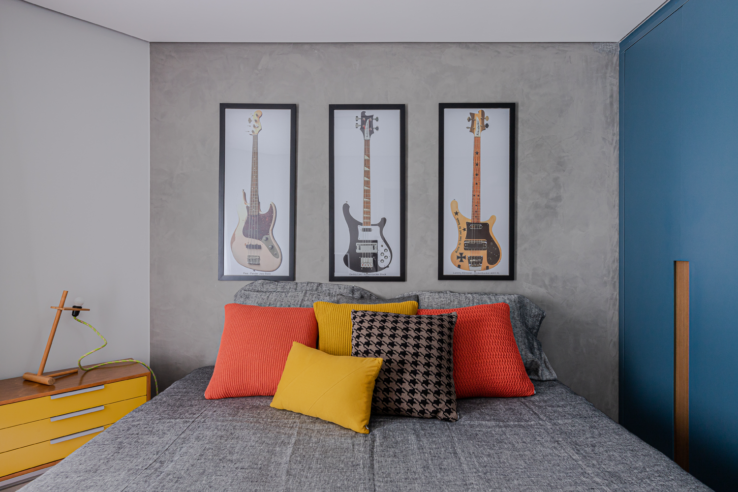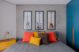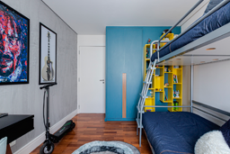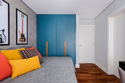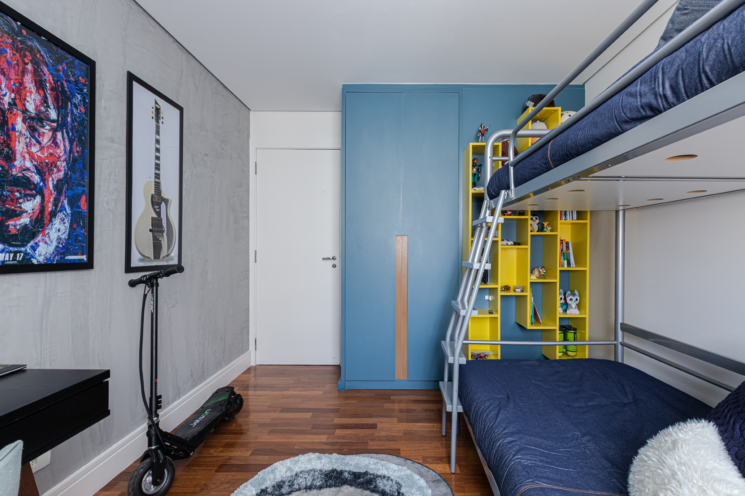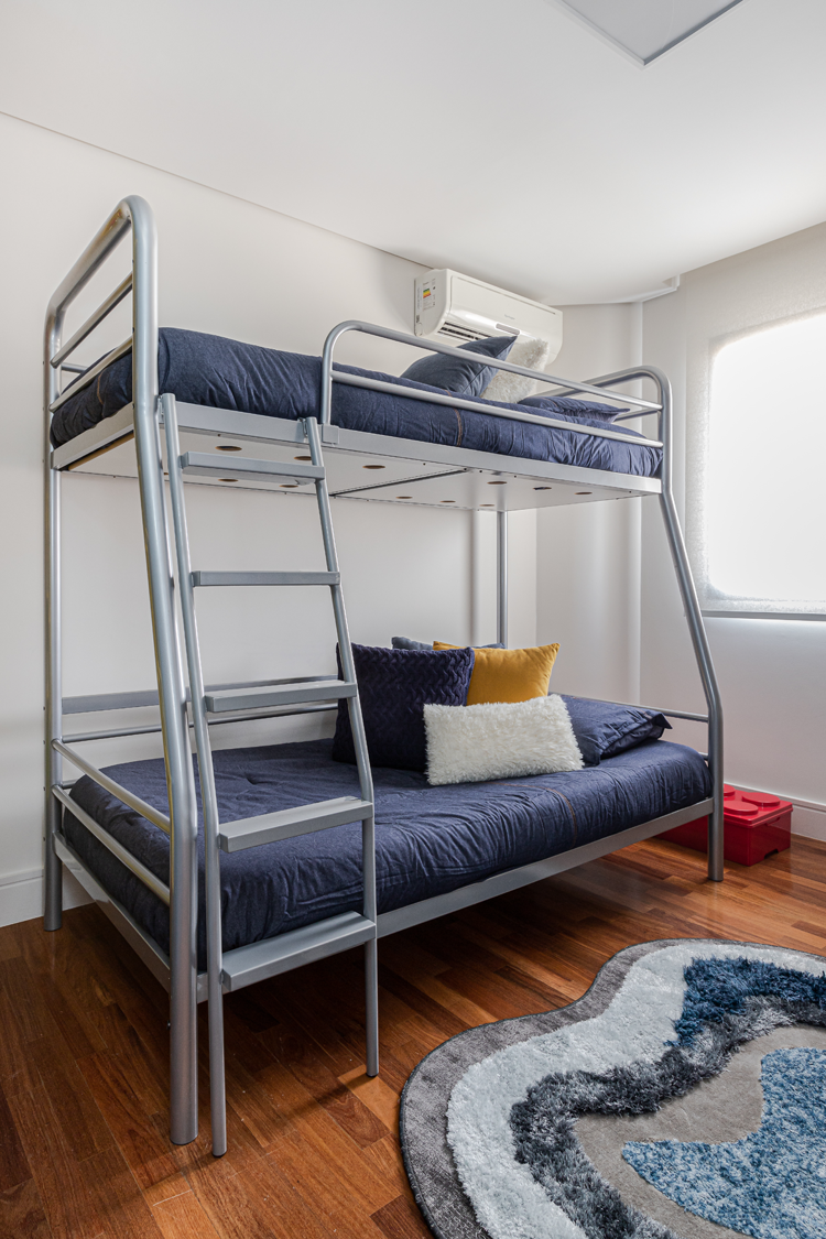 Enquanto no quarto de casal todo os materiais remetem ao bem-estar e sensação de acolhimento, no outro quarto apostamos numa atmosfera mais jovem, apostando em toques de cor para deixar tudo mais aconchegante. O efeito cimento queimado predomina nas paredes e contrapõe ao calor do piso de madeira, acompanhado pelos detalhes coloridos. nos detalhes coloridos. Já no quarto infantil, um beliche de estrutura tubular se destaca ao lado da escrivaninha. Além deles, o armário azul e a estante amarela comprovam a personalidade do jovem morador.