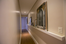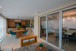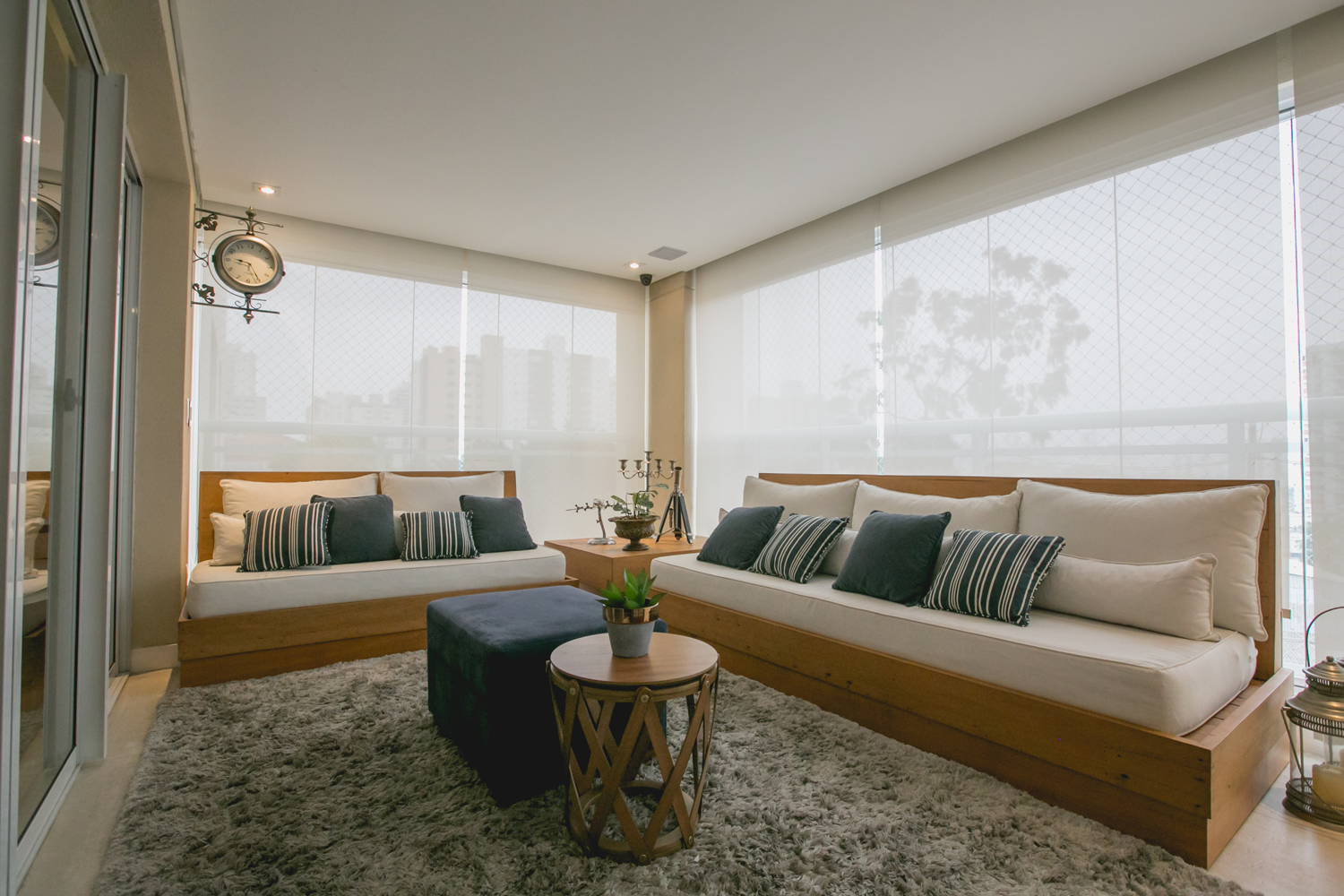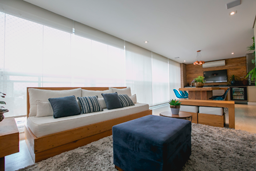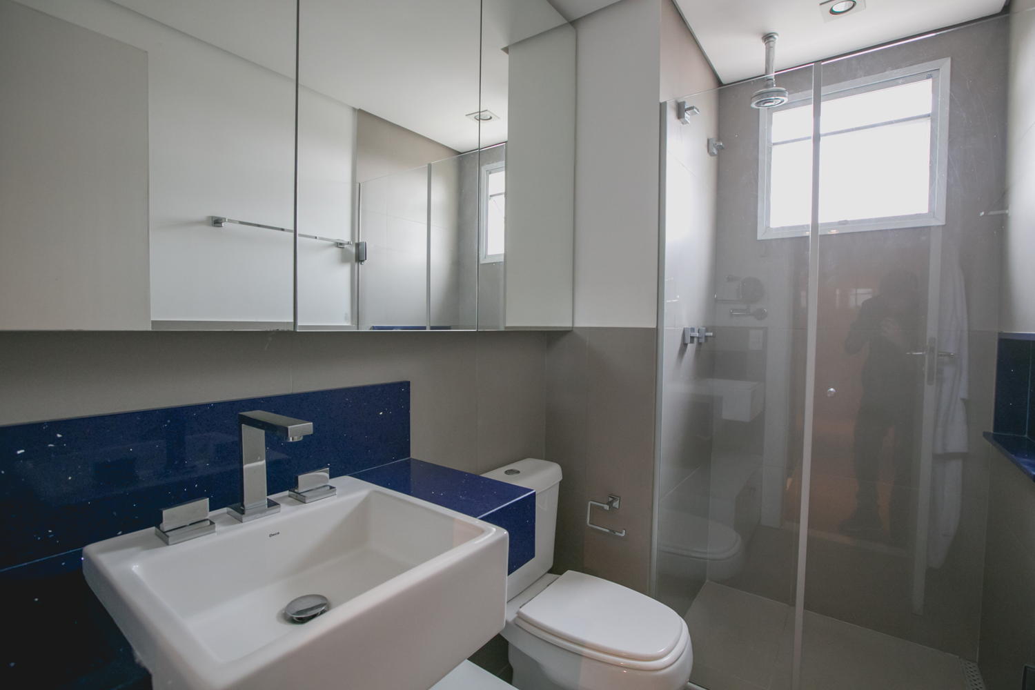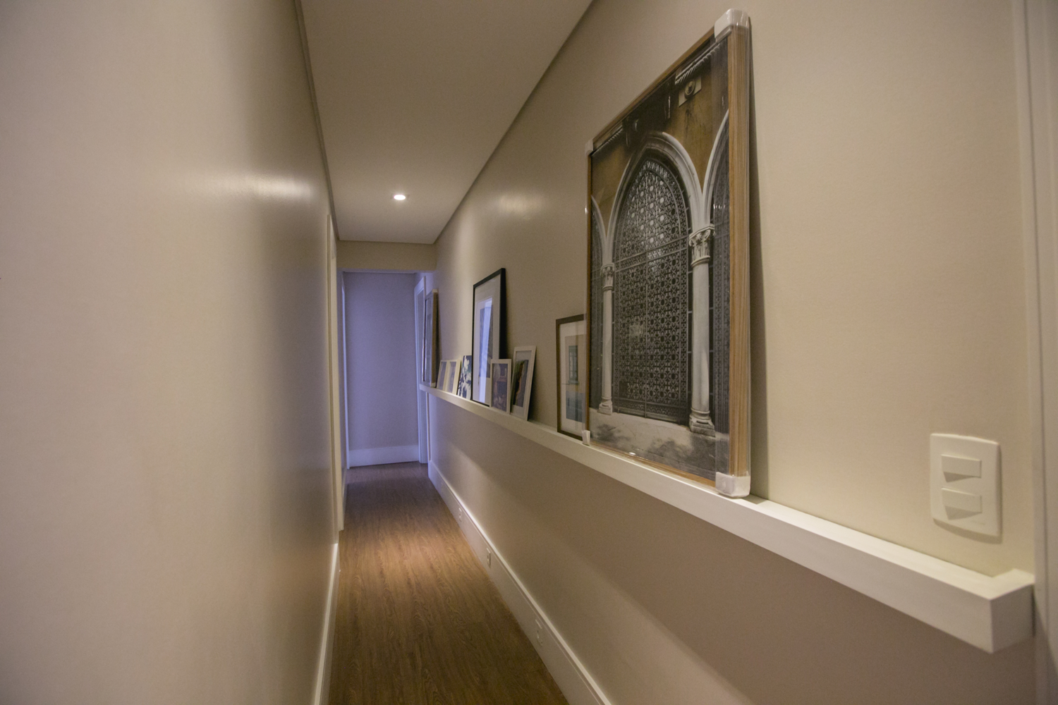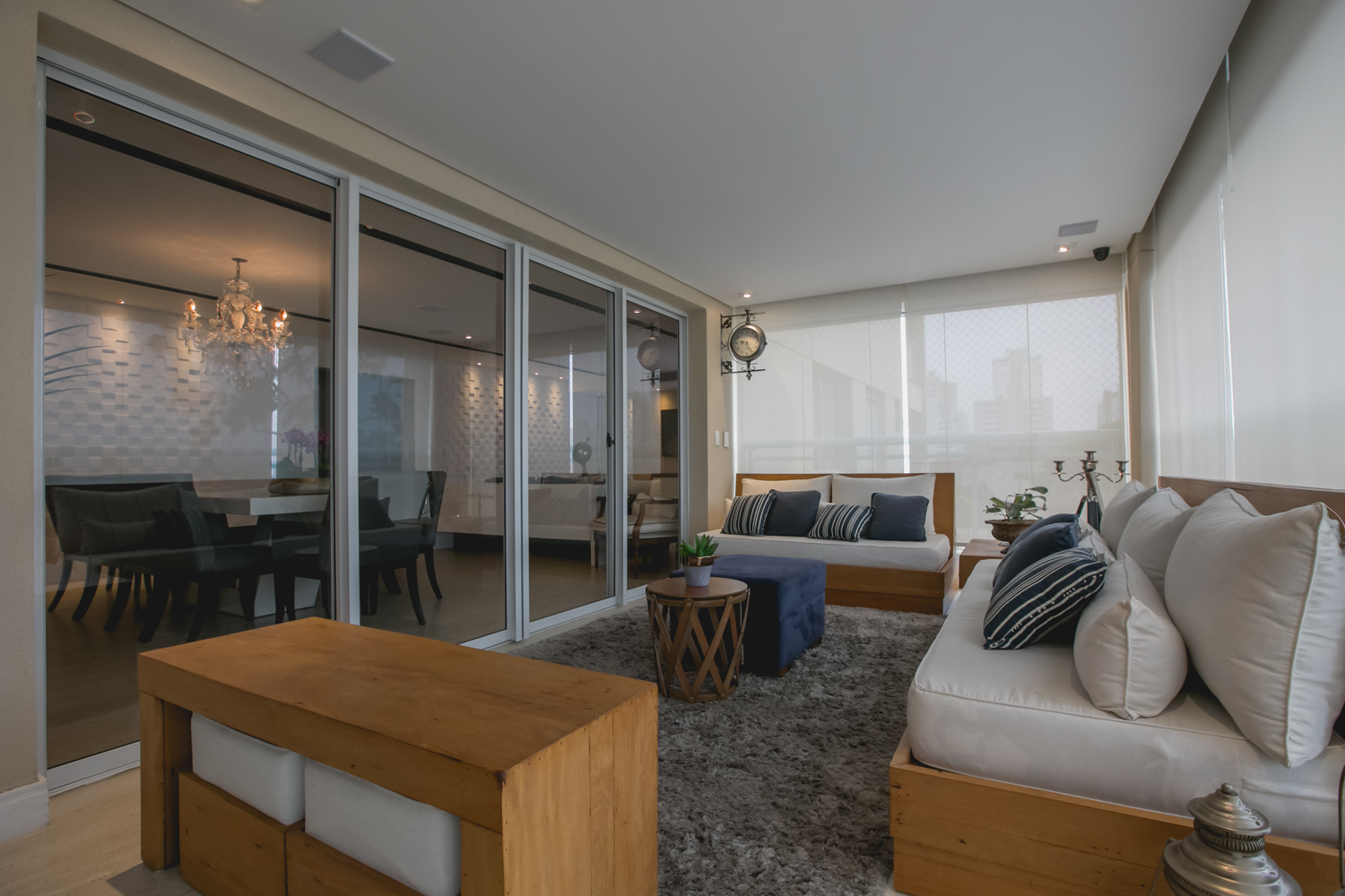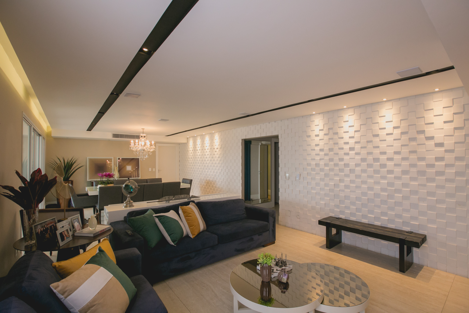 Neste imóvel de 235 m² foi feita uma reforma total, começando pela integração de estar e jantar. Originalmente, existiam quatro suítes, sendo que uma delas foi transformada em dois ambientes, uma adega e um escritório. Na entrada, vemos o estar que conta com um sofá azul-marinho. O aparador branco, a mesa de centro espelhada e uma outra peça ao lado do sofá servem como apoio para objetos escolhidos pelos moradores, que também adoram receber. Para aumentar a sensação de amplitude, na mesma parede onde se encontra o rack, foram embutidos dois espelhos, um de cada lado, que seguem do chão ao teto. Os espelhos são portas de correr que dão acesso de um lado ao escritório e do outro a adega.