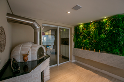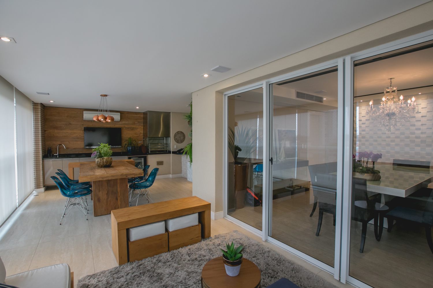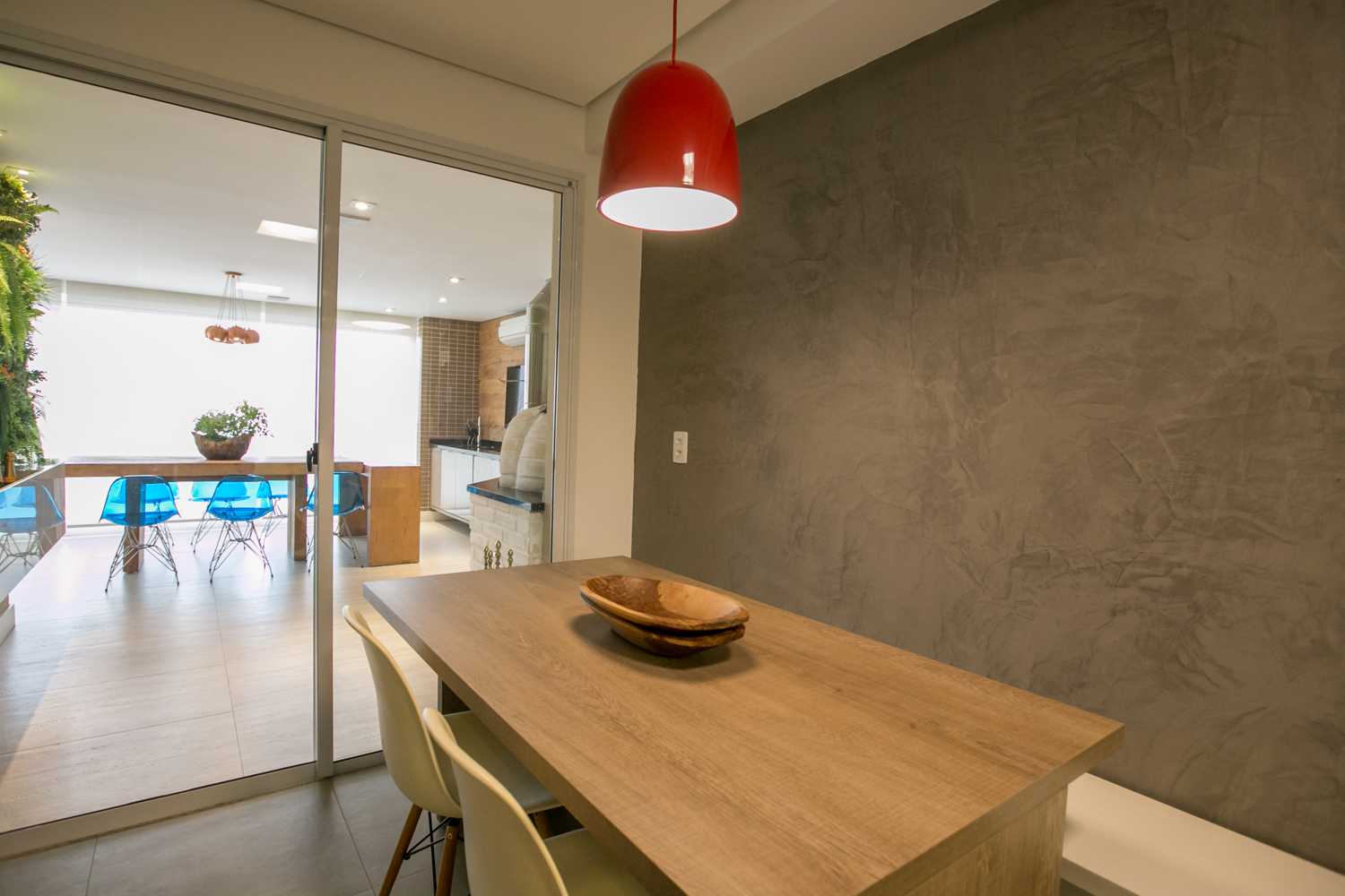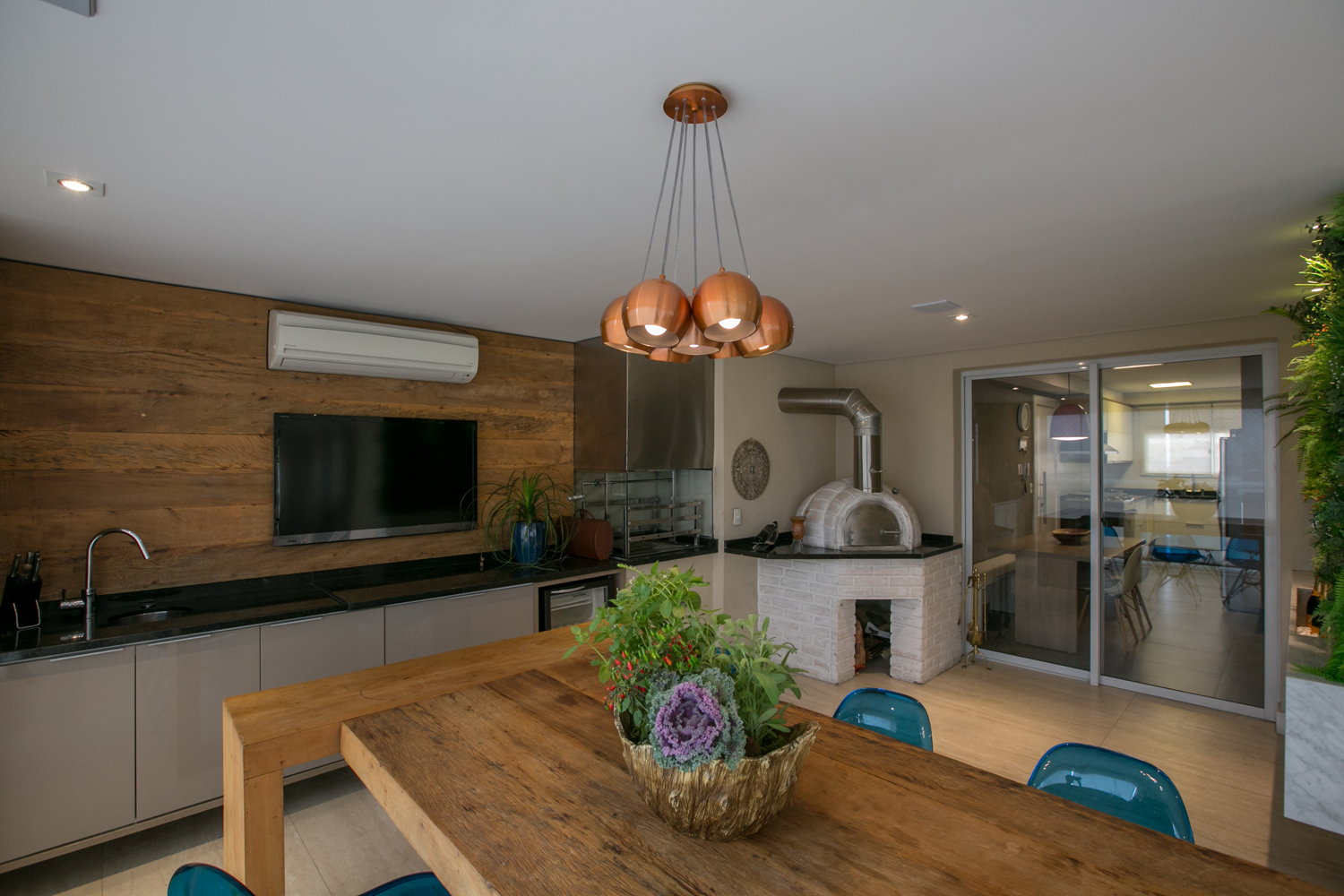 Atração da reforma, a varanda gourmet oferece dois ambientes bem agradáveis. Um deles recebeu a churrasqueira e um forno de pizza. Para dar um tom rústico, uma das paredes e a mesa são de madeira de demolição. A outra parte do cômodo traz um estar bem confortável.