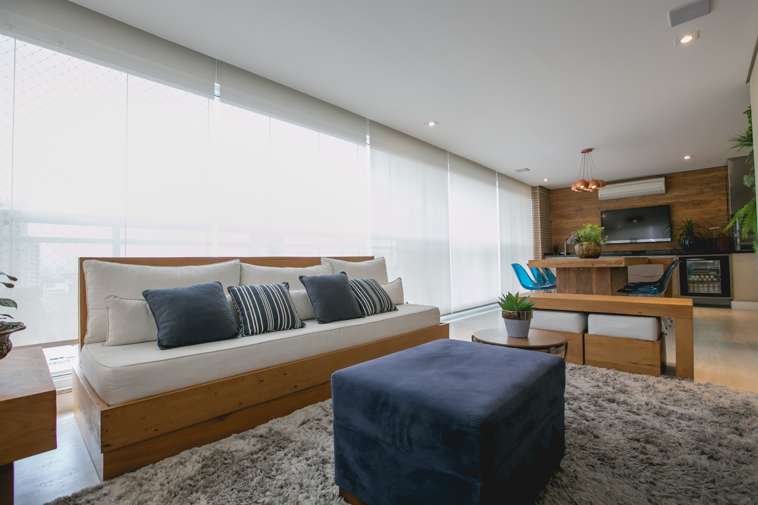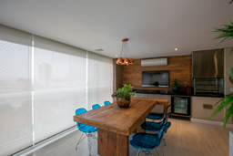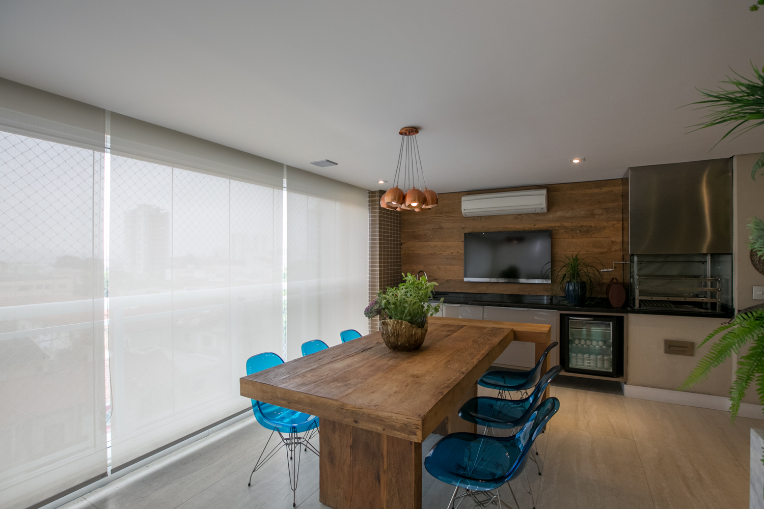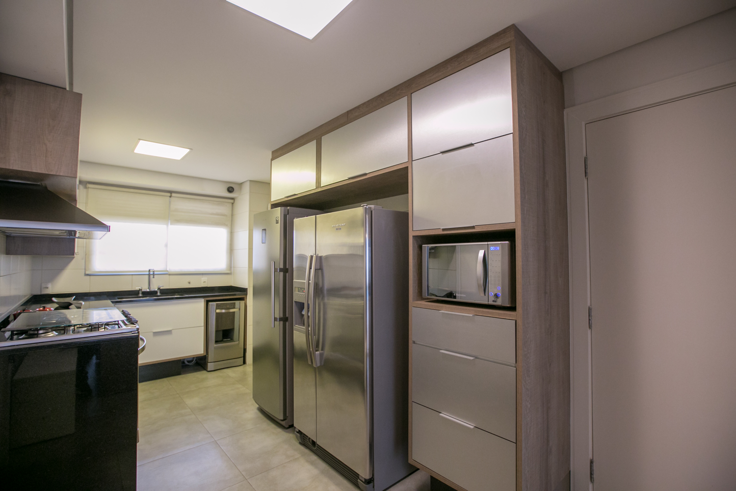 Os armários sob medida harmonizam com os eletrodomésticos inox da cozinha. Com centímetros muito bem ocupados, o ambiente conta com uma mesa de madeira acompanhada por um banco, em uma das laterais, e cadeiras do outro lado. Ambiente de maior sucesso nos últimos tempos, o home office ficou completo, reunindo adega e duas estantes para armazenar livros, bebidas, taças e objetos pessoais.