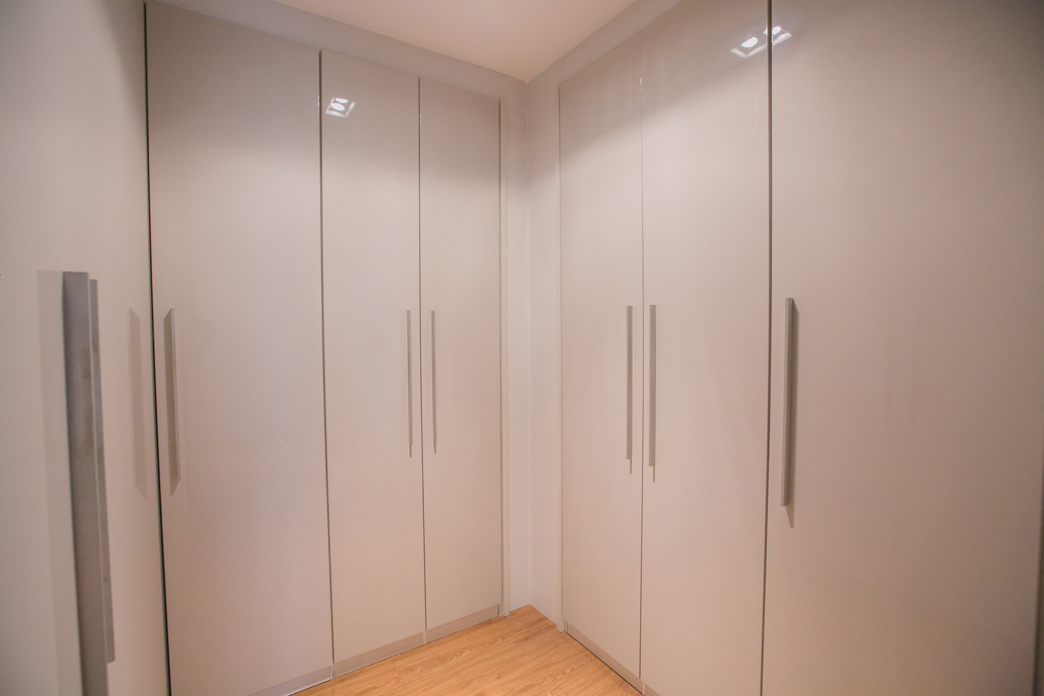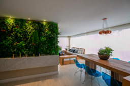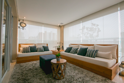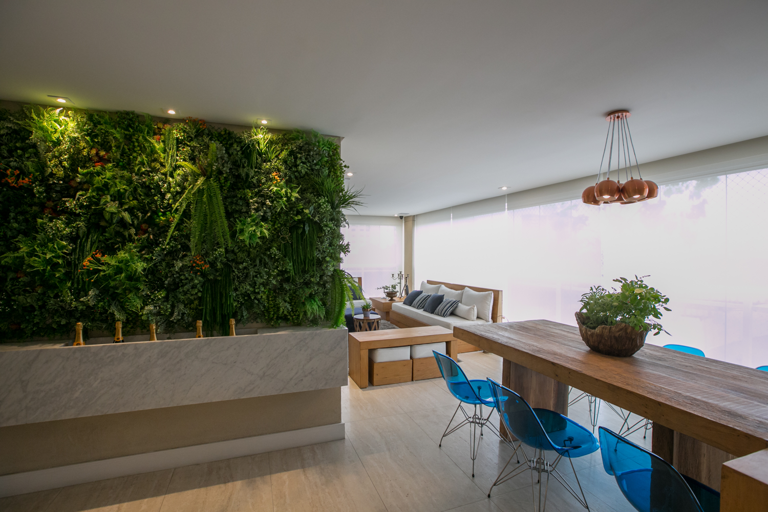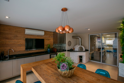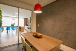 Os armários sob medida harmonizam com os eletrodomésticos inox da cozinha. Com centímetros muito bem ocupados, o ambiente conta com uma mesa de madeira acompanhada por um banco, em uma das laterais, e cadeiras do outro lado. Ambiente de maior sucesso nos últimos tempos, o home office ficou completo, reunindo adega e duas estantes para armazenar livros, bebidas, taças e objetos pessoais.