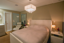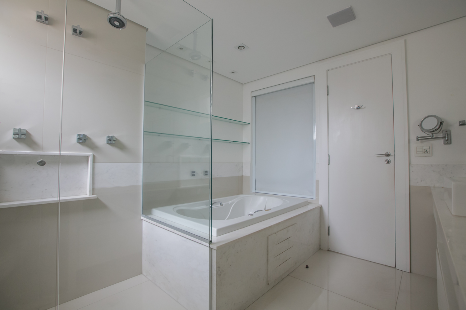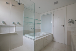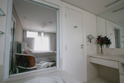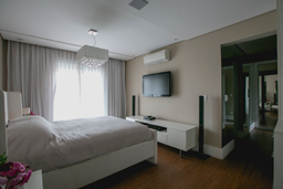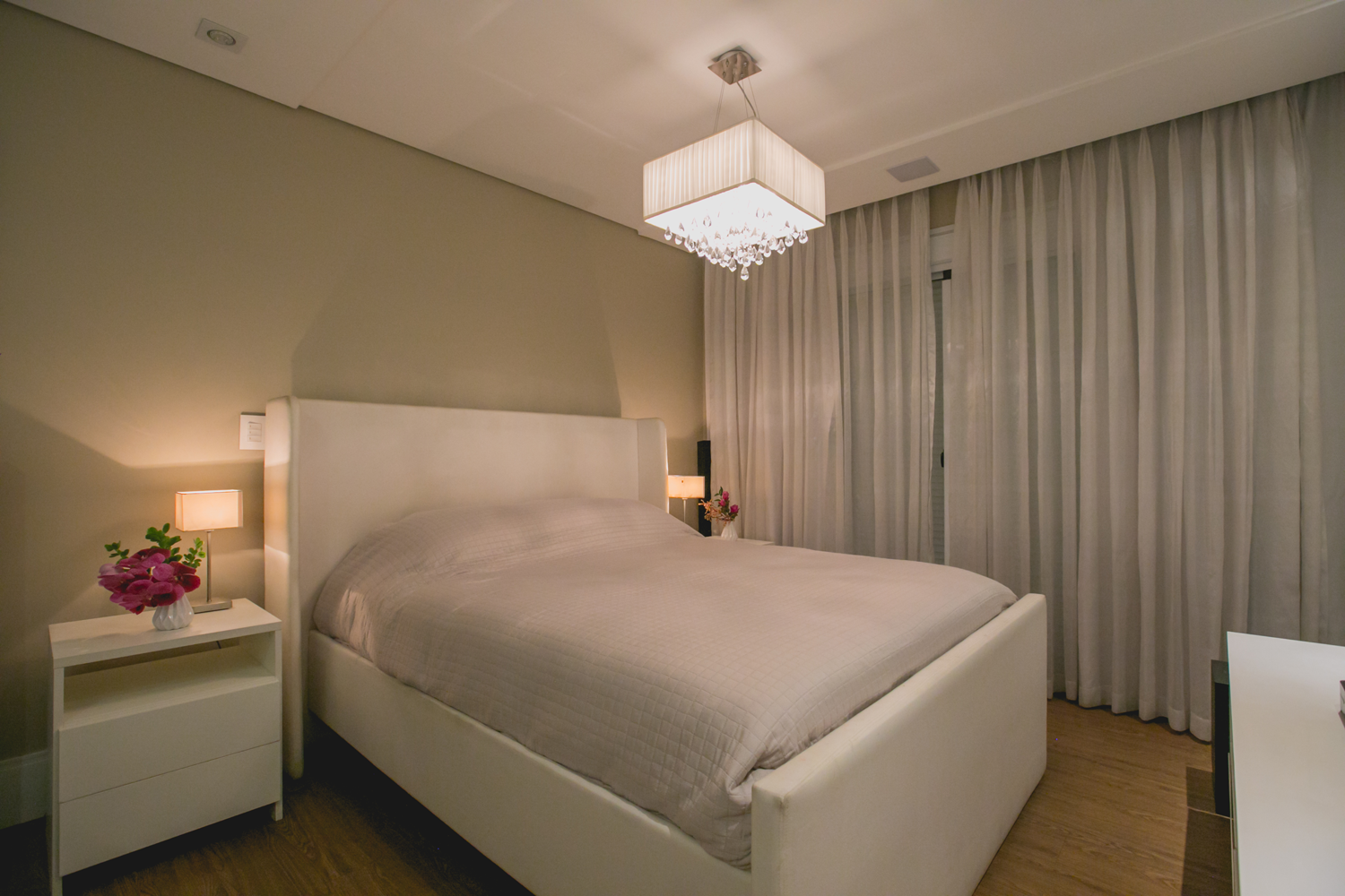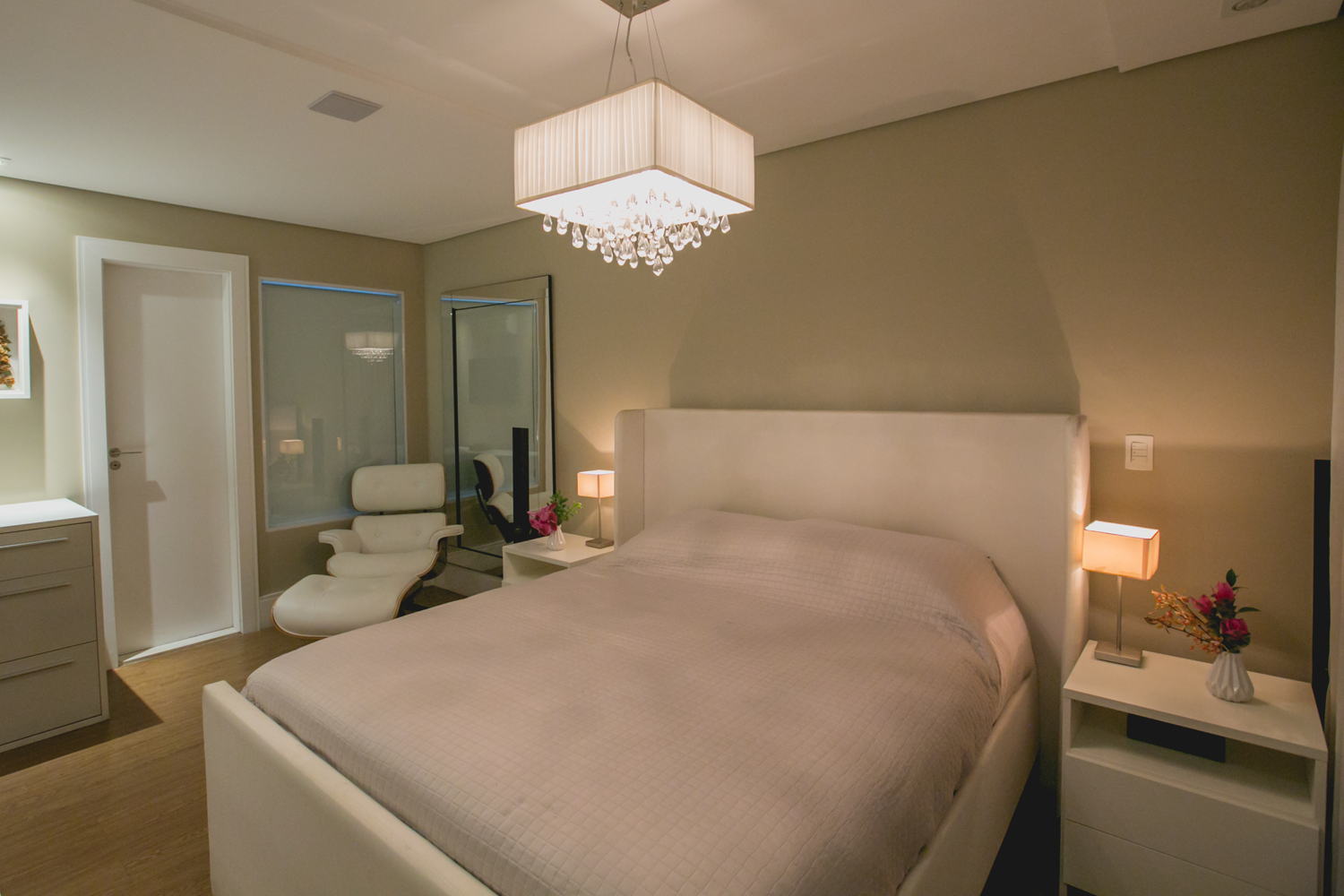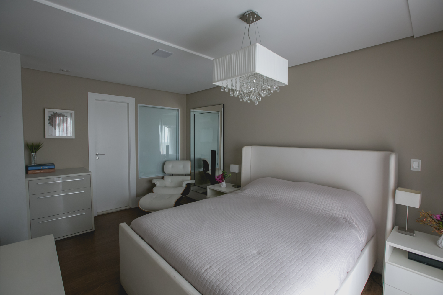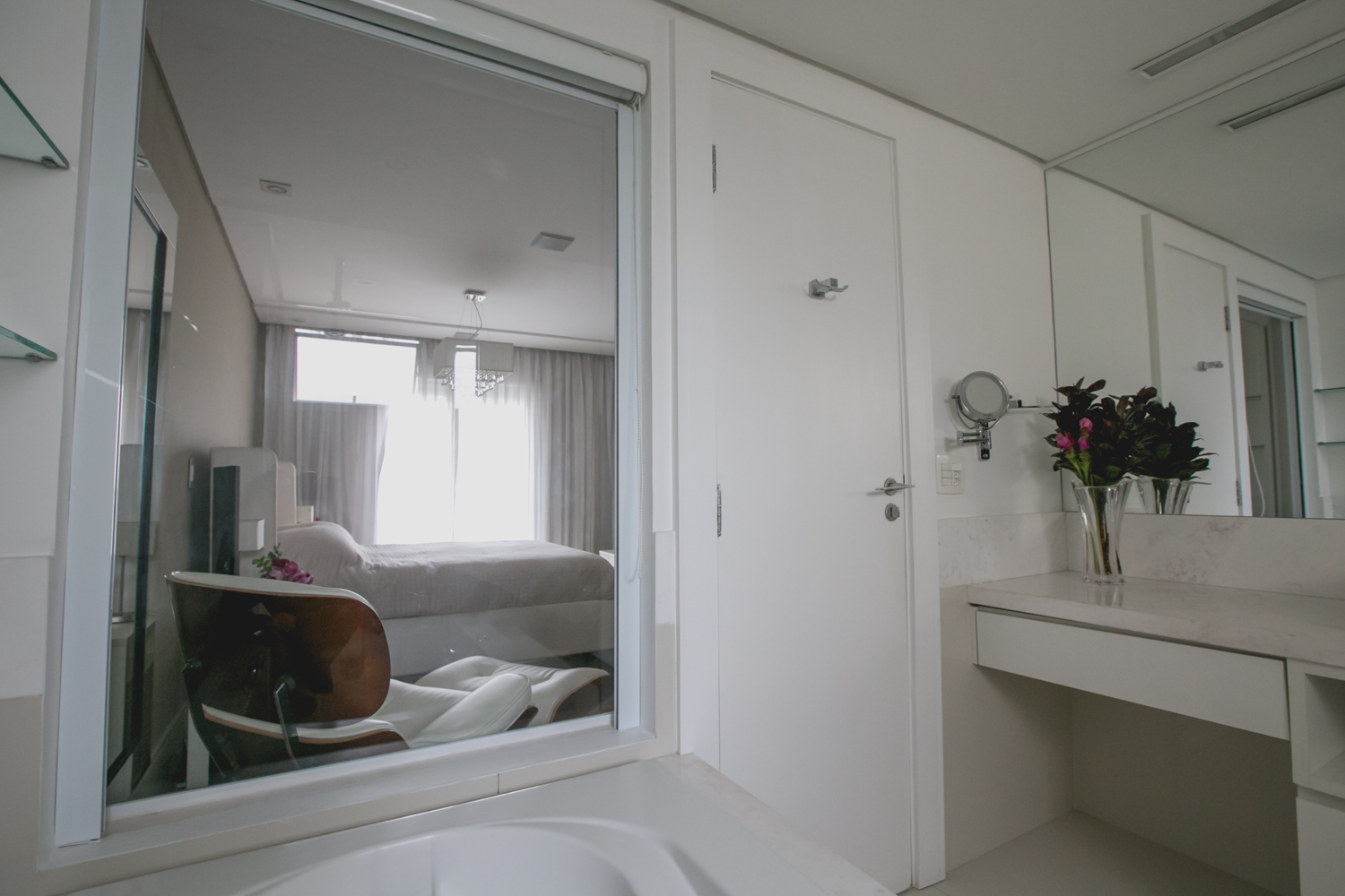 O quarto de casal revela um moodboard neutro, transmitindo o tão desejado ar de tranquilidade. Quem rouba a cena é o lustre de cristal com pingentes, deixando o cômodo mais elegante. A suíte contém uma janela que cuida de conectá-la ao quarto. Além disso, esse ambiente dispõe de uma banheira revestida de mármore.